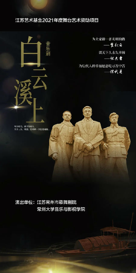 音乐剧《白云溪上》截取了“常州三杰”瞿秋白、张太雷、恽代英短暂而又光辉的生命须臾、情感点滴为素材,以当代青年的人生追求为主线,表达了老一辈无产阶级革命家为谋人民之幸福而舍生忘死的人生追求,也展现了当代青年不忘初心,牢记使命,为了创造美好生活而努力拼搏的人生选择。