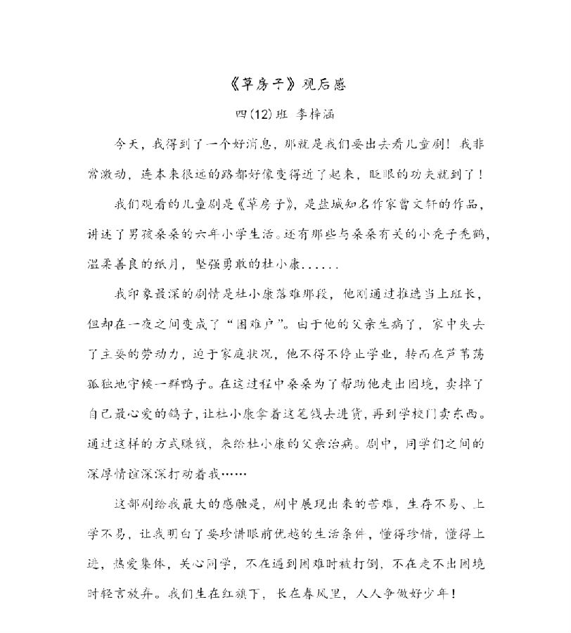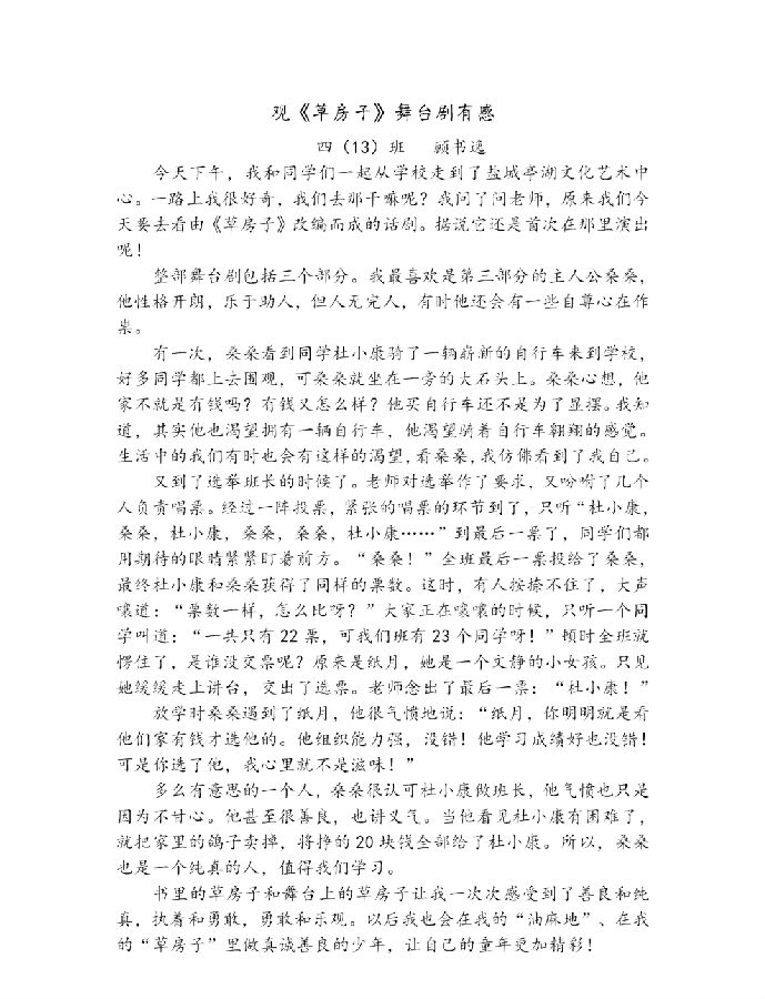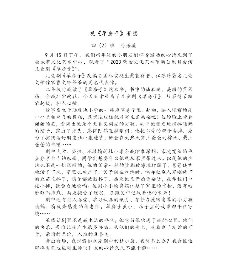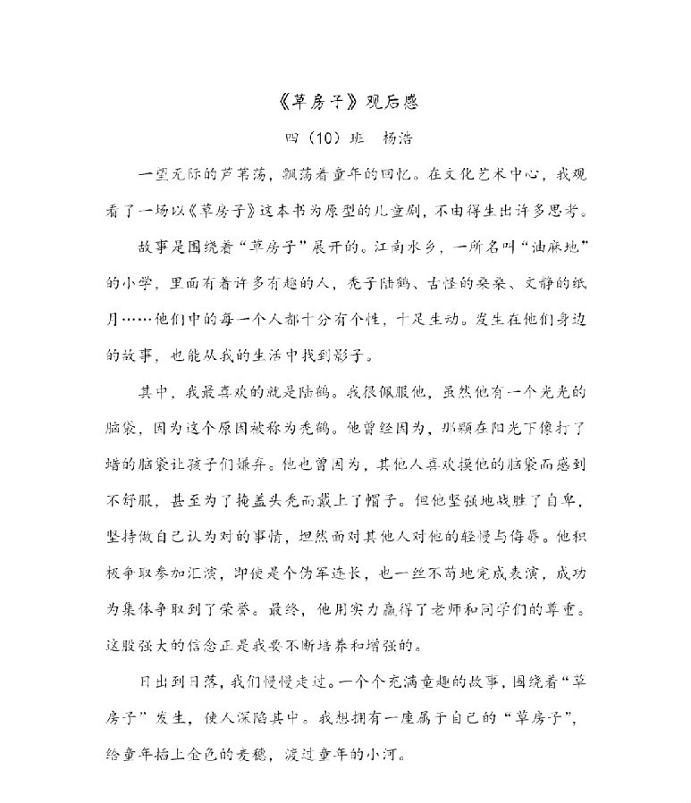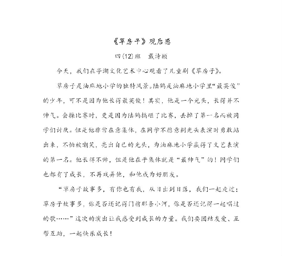 捕捉斑斓色彩,品味曲调悠扬。宛如多声部并存于一曲歌舞的“复调乐章”,儿童剧《草房子》无疑是一场视听盛宴。同学们走出课堂,开阔眼界,在观剧中滋养心灵,激发艺术兴趣,提升美学修养。