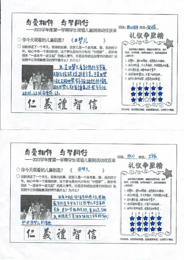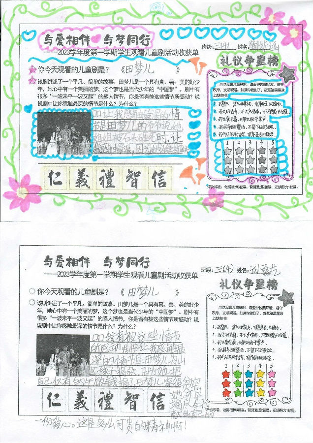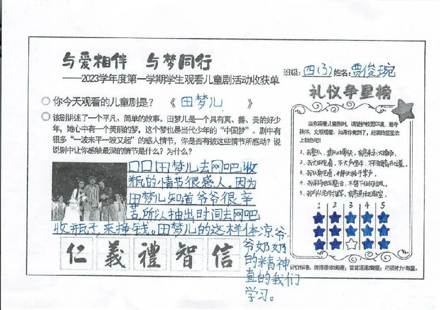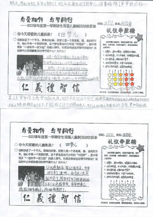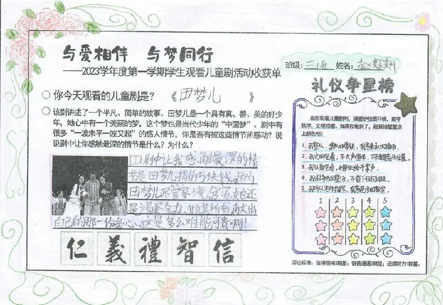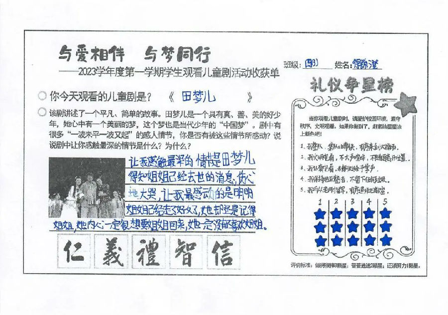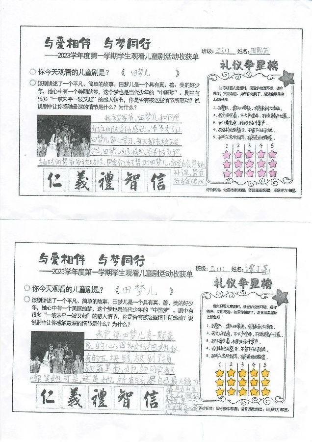 通过观看儿童剧《田梦儿》,激励了学生对优秀民族传统的精神追求,同时以艺术审美的方式来陶冶情操、提升涵养、滋补心灵、凝聚人心,让学生们感受到传统美德的魅力,感受到爱的温暖!
