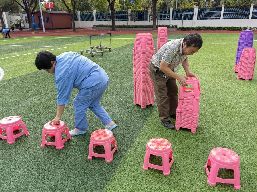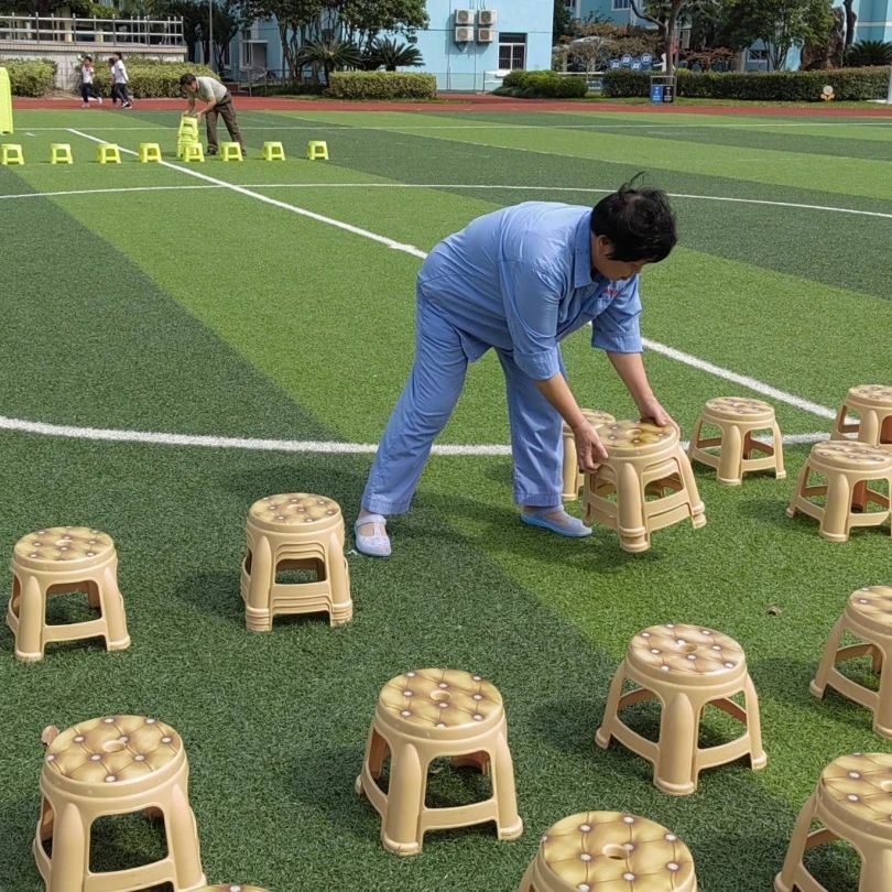 活动前一天,小朋友们、学校乔师傅和阿姨们已经开始紧锣密鼓地准备着,一个又一个小凳子整整齐齐的摆放在了操场上,等待着小朋友们的到来。