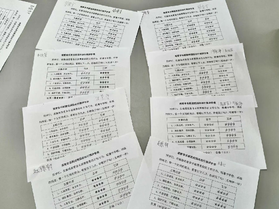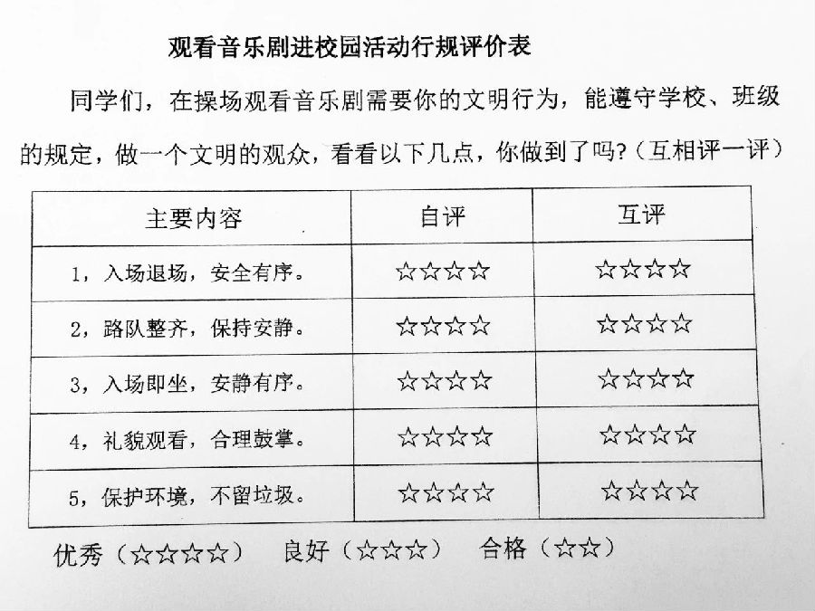 观看结束后,各班有序回到了教室里,但是小朋友们的心中久久不能平静,他们在班主任的引导下分享了自己的所感所想,填写了观看音乐剧进校园活动行规评价表。