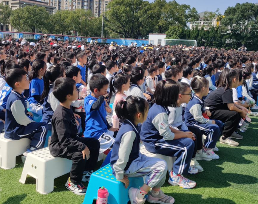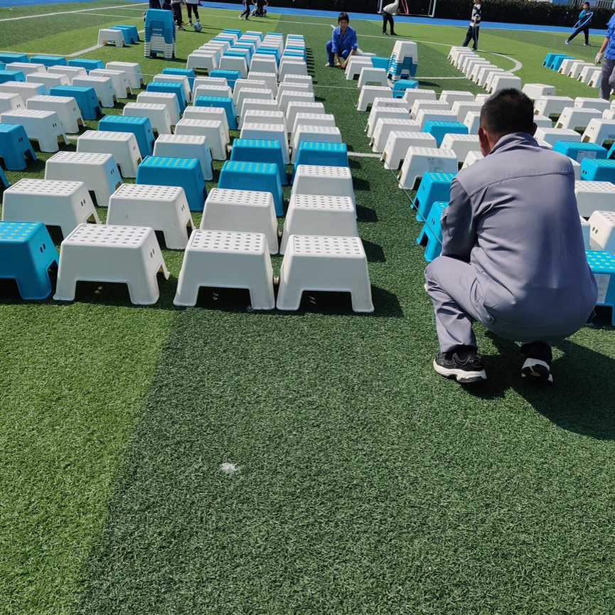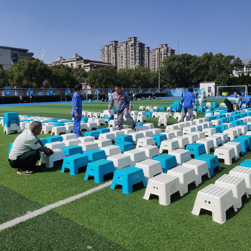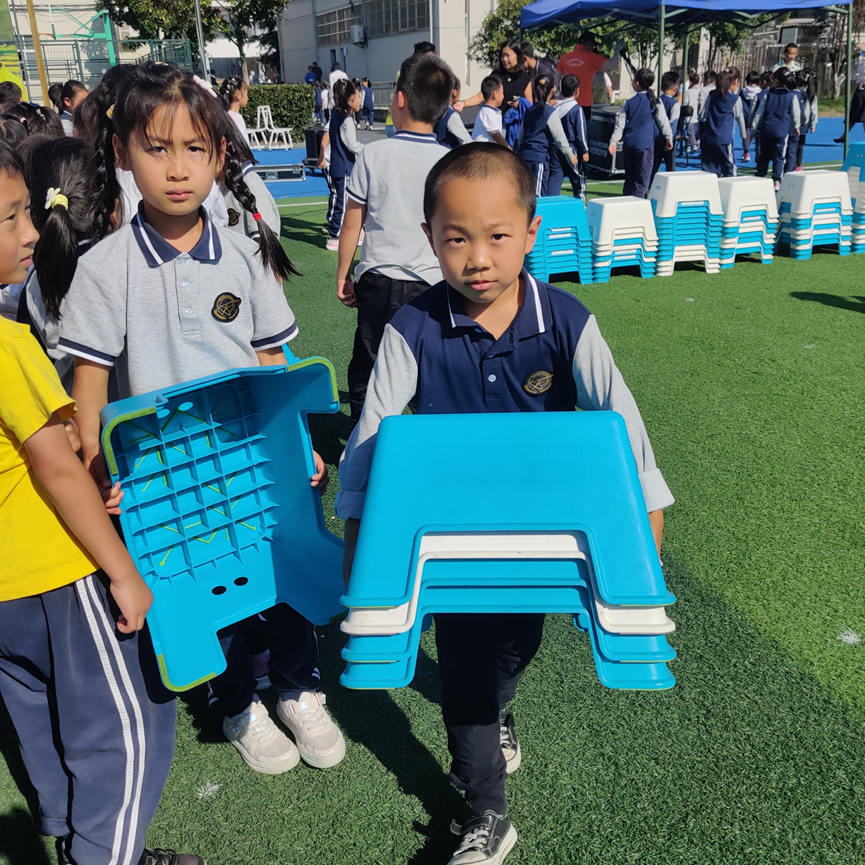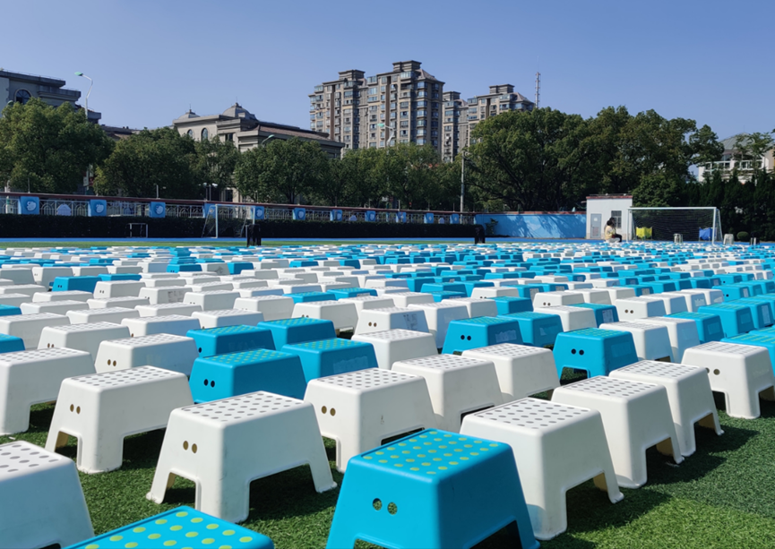 活动当天上午,学校保安、保洁师傅和阿姨们就开始紧锣密鼓地准备着,一个又一个小凳子整整齐齐地摆放在了操场上。
