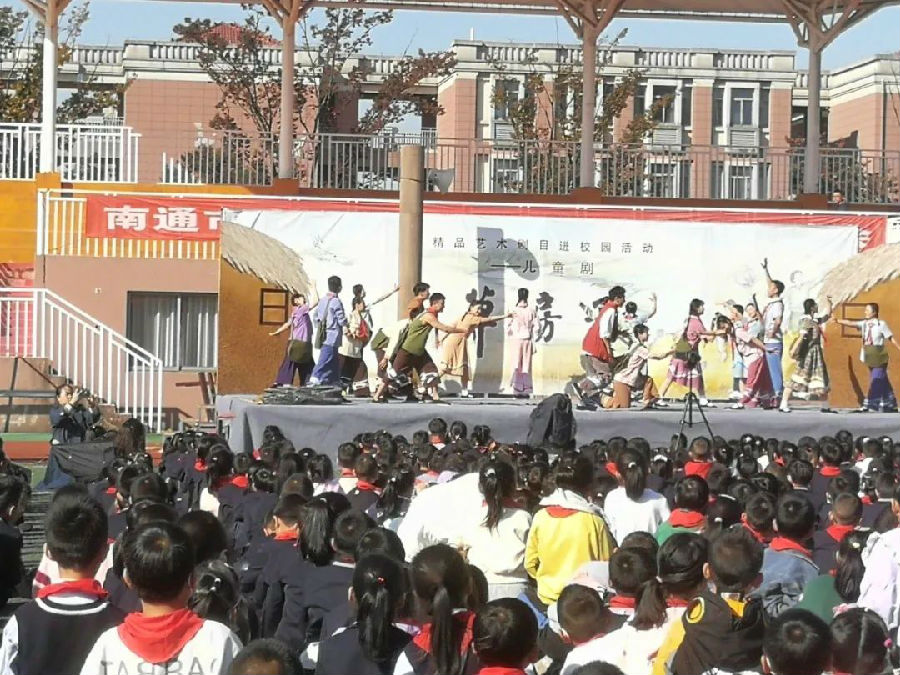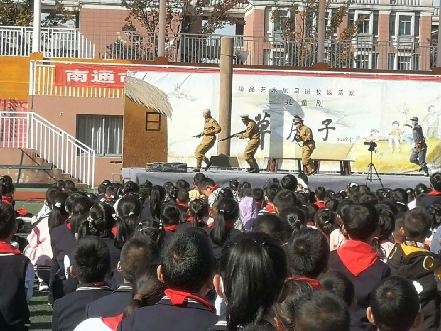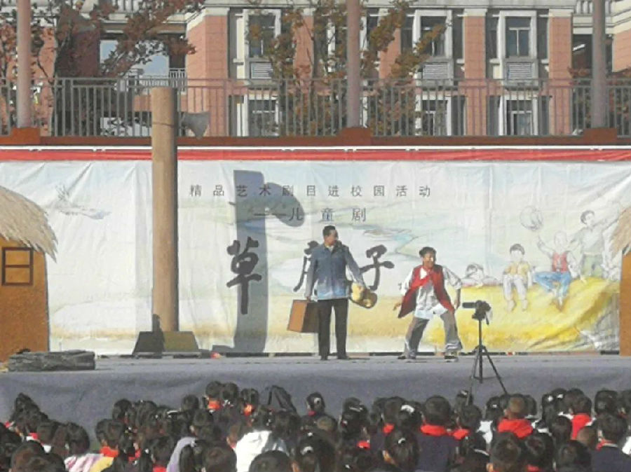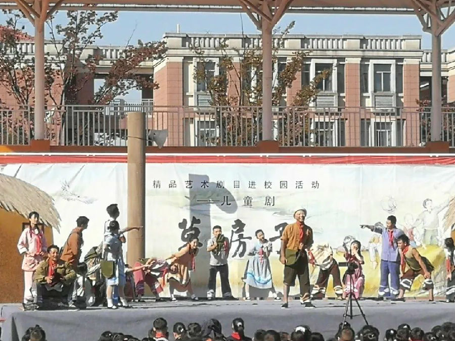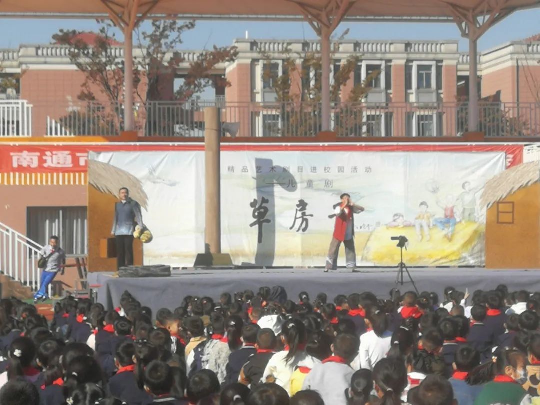 “草房子故事多,有你也有我。从日出到日落,我们一起走过;草房子故事多,你是否还记得门前那条小河,你是否还记得一起唱过的歌。” 11月7日上午,秋阳高照,伴随着优美的童声主题曲,优秀儿童剧《草房子》在小海小学的操场上拉开了帷幕。