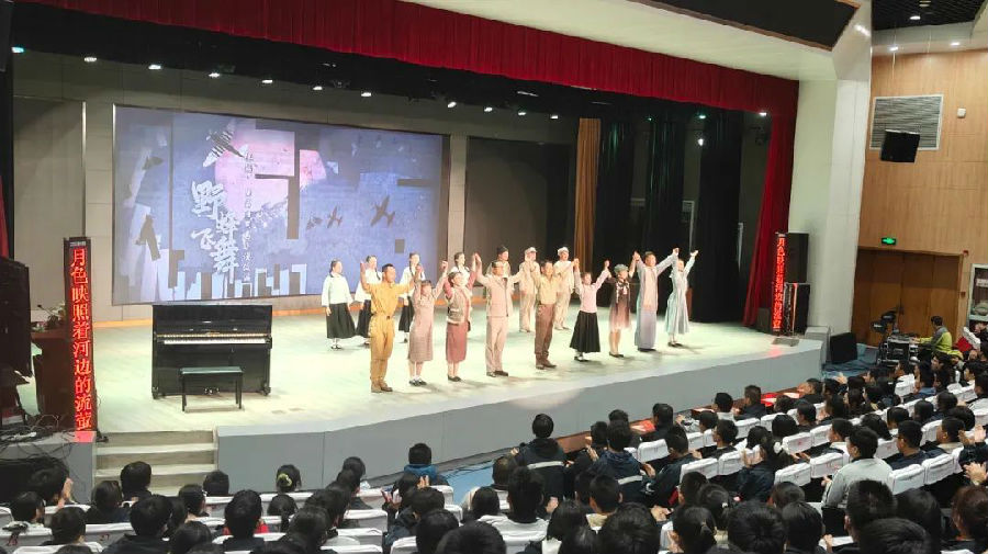 本剧讲述了抗战全面爆发时期,热血青年沈天路投奔黄橙子家庭,在两家人的培养下投身革命事业并为之献身的故事。随着情节发展,同学们多次爆发出雷鸣般的掌声。尤其当沈天路为国捐躯,将整部剧推向高潮之时,许多同学不禁潸然泪下。《野蜂飞舞》的乐曲声既是黄橙子对沈天路的怀念,更久久回荡在同学们耳边,这是一场无比生动的爱国主义教育。
