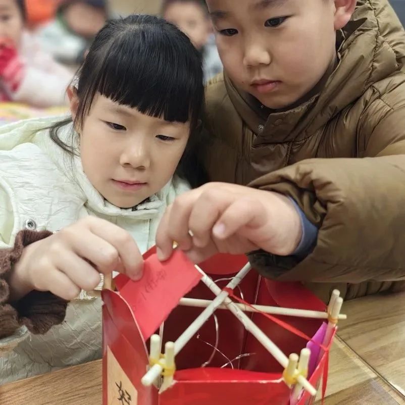 各班班主任组织学生制作灯笼和灯谜。学生们利用手中材料,如纸盒、塑料瓶、彩纸等,设计出各式各样的花灯,有动物形状的、卡通形象的、地标建筑的等等。每个花灯都富有个性和创意,展现了学生们的想象力和手工技巧。
