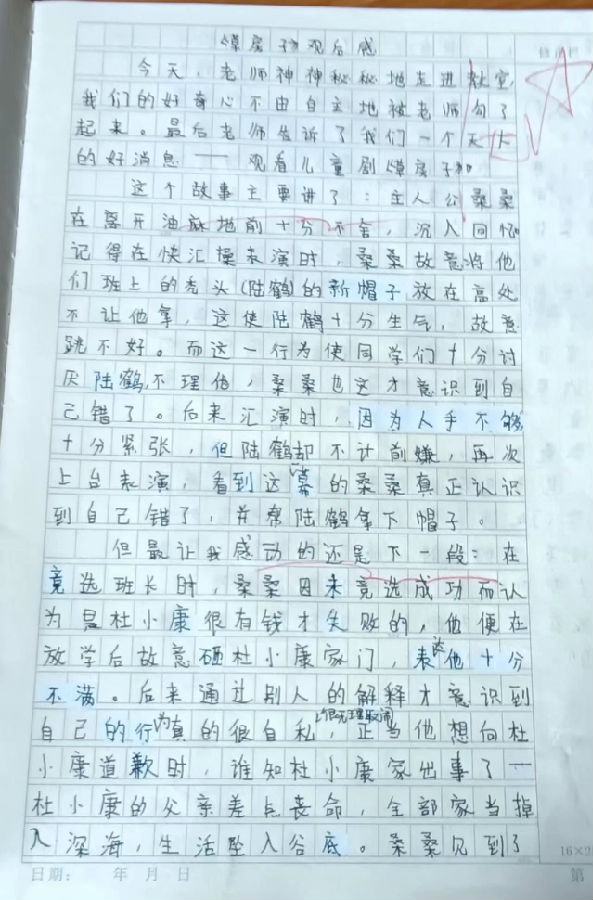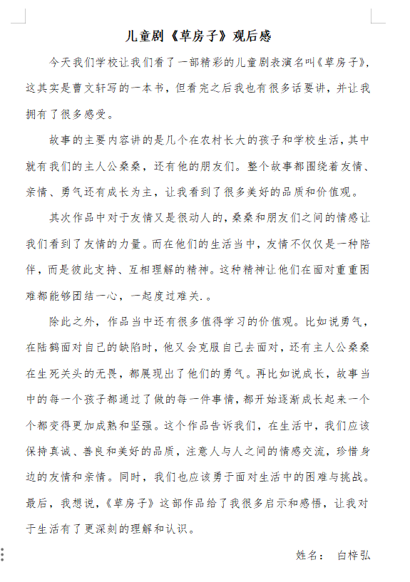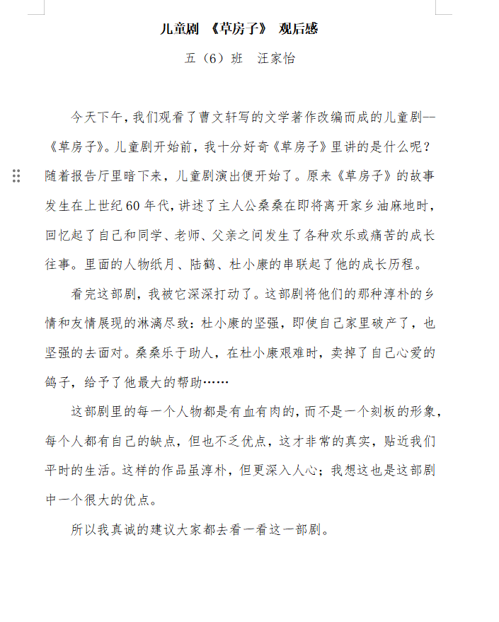 “刚开学就能看到这样一部好看的儿童剧,真的太开心了!《草房子》的故事我们都很熟悉,但亲眼看见桑桑、纸月、陆鹤还有杜小康活灵活现登上舞台,还是觉得非常新鲜有趣、形象生动,发生在油麻地童年故事更是深深打动了我,他们身上所展现出的乐观坚强、善良友爱的品质,给我树立了学习的榜样”。三(1)班的成思涵跟同学们观看的是学校的第5场演出,在她的眼中看不到演员们的丝毫疲惫,舞台上每个角色的演绎都十分到位,完全符合她想象中的人物形象。