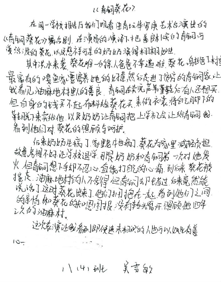 今天,升旗时,老师在升旗台上说“今天下午,七、八年级组织去报告厅看舞台剧,《青铜葵花》。”此话一出,操场顿时沸腾了起来。