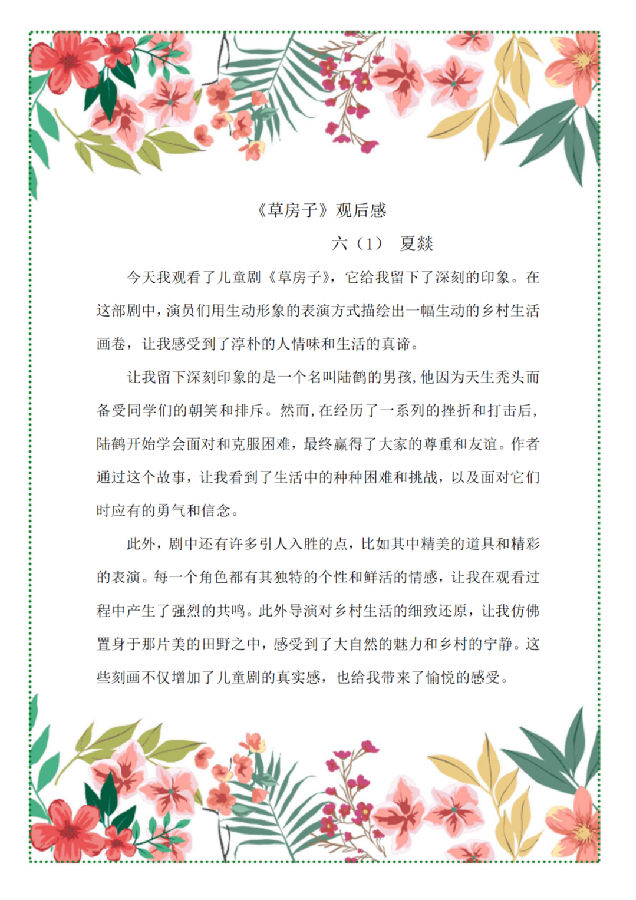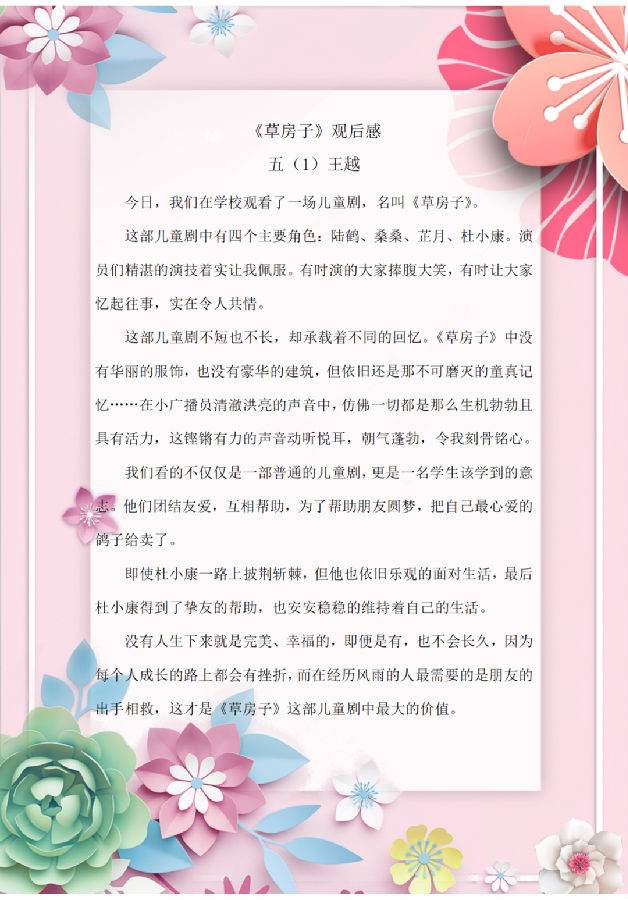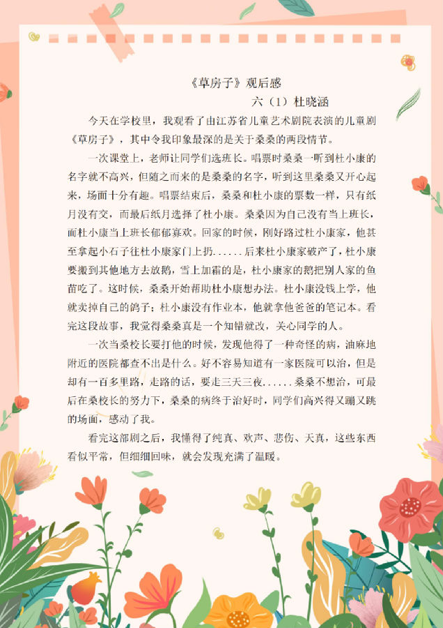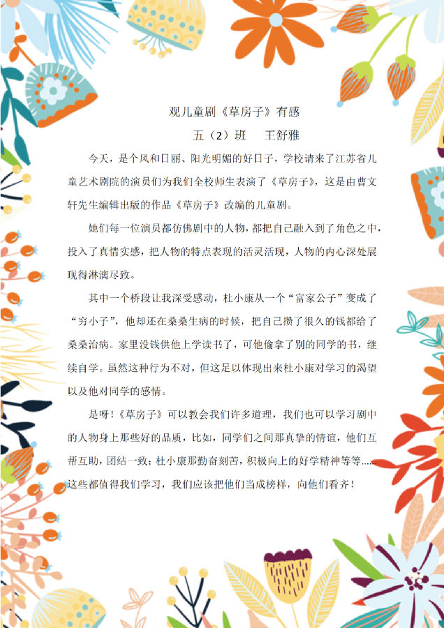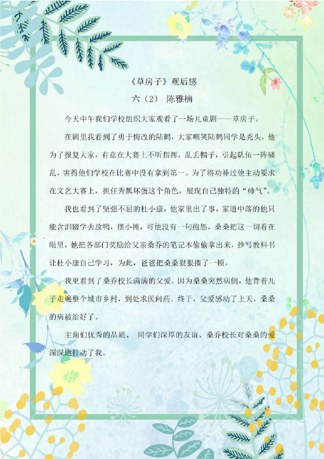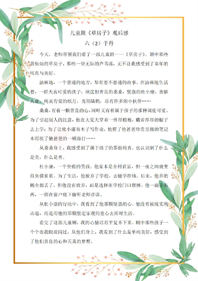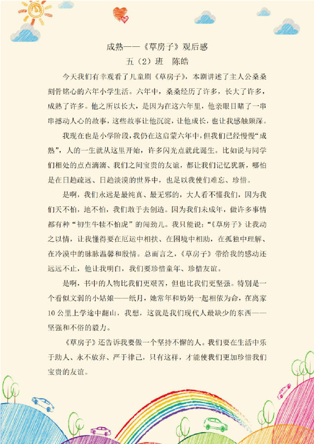观看完儿童剧《草房子》,队员们零距离感受到儿童戏剧艺术的魅力,让以前在书上看到的桑桑、纸月、陆鹤和杜小康等人物,在舞台上“活”了起来,同学之间的友谊、家人之间的亲情,还有同学和老师的师生情都让人非常感动,剧目结束后,队员们纷纷交流着自己心中的收获。