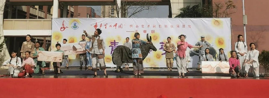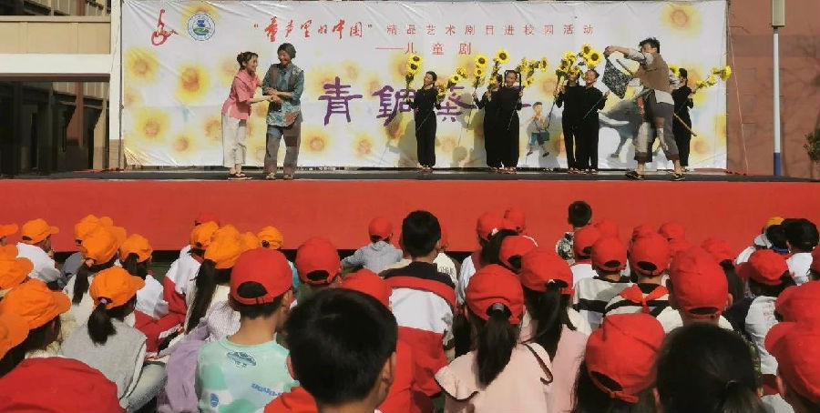 今天,学校组织学生集体观看《青铜葵花》儿童剧。《青铜葵花》是著名作家曹文轩的作品。讲述了失去父母的葵花被青铜一家收养,发生了一系列有趣而又感人的故事。