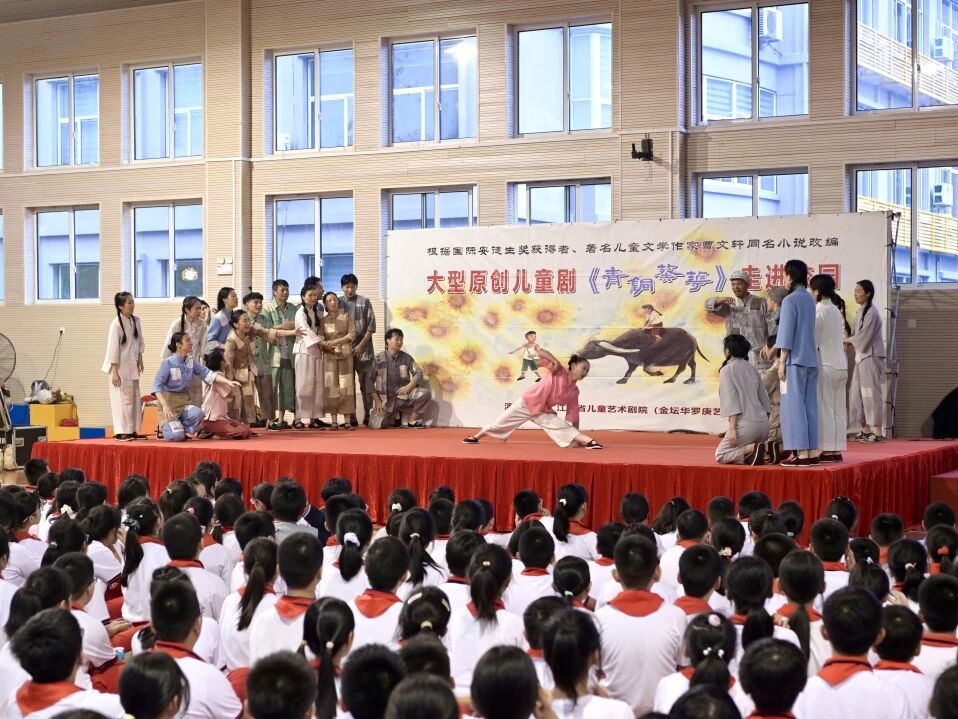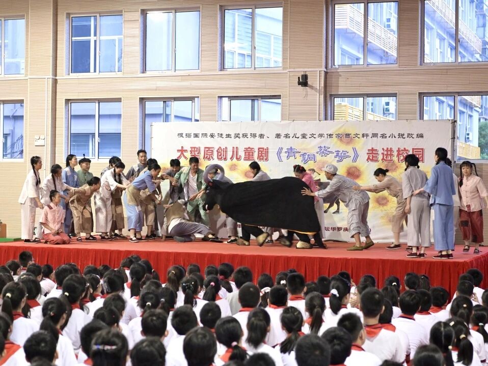 该剧改编自曹文轩先生的经典同名小说,讲述了孤女葵花与哑巴少年青铜一家在苦难岁月中相互扶持、共同成长的动人故事。剧中,青铜无私守护、葵花懂事好学、奶奶慈祥淳朴、老牛憨态可掬,一家人虽饱经洪灾、饥荒等磨难,却始终以坚韧的意志与无私的爱彼此支撑、温暖前行。奶奶的离世带来了沉重的考验,但也将坚强与乐观的种子深植于兄妹心中。剧目通过精湛的舞台艺术,将苦难中的美丽、挫折中的成长主题演绎得淋漓尽致,深深打动了在场每一位师生。