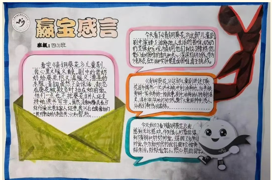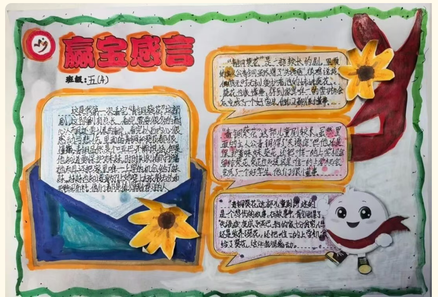 “青铜葵花”这部儿童剧讲述的是一个悲伤的故事,在故事中,青铜得了“失语症”,变成了哑巴,他的家人十分贫穷,但还是收养了葵花,还把唯一的上学机会给了葵花,这让我很感动。