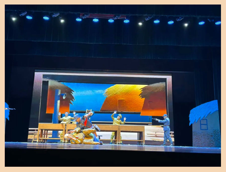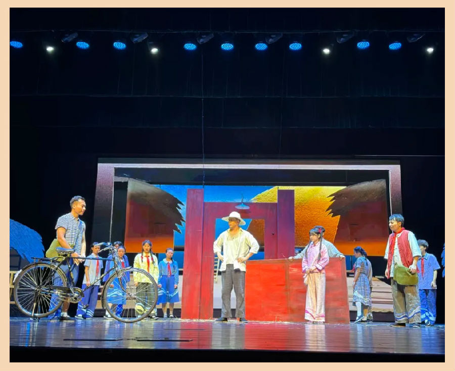 儿童剧《草房子》的幕布一拉开,便将 “油麻地” 的生机与暖意搬上了舞台。浅褐稻草带着阳光气息,矮小草房的红布条轻轻晃动,投影幕上的 “大河” 泛着粼粼波光,连空气里都似有稻香萦绕,孩子们不禁惊叹这与书中如出一辙的场景。随后,桑桑攥着纸飞机呼唤纸月,纯粹的友谊让孩子想起自己的伙伴;杜小康从光鲜到历经变故再勇敢回归,也让孩子们在掌声中读懂挫折是成长的养分,每一幕都满是童年的温柔。