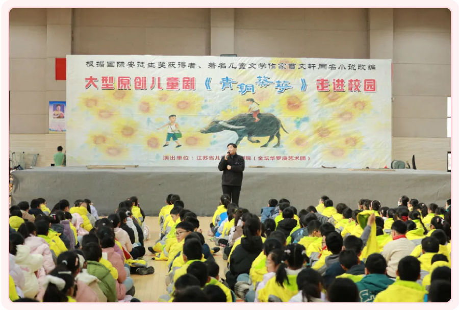 艺术,润泽着人类的心灵,又照亮着人类精神的前行之路。江苏省儿童艺术剧院携儿童剧《青铜葵花》为广大师生献上一场感人至深的演出。该剧改编自曹文轩先生的经典小说《青铜葵花》,生动还原了油麦地少年青铜与城市女孩葵花跨越苦难的成长故事,深刻展现出兄妹情深、逆境坚守与人性本真的动人力量。