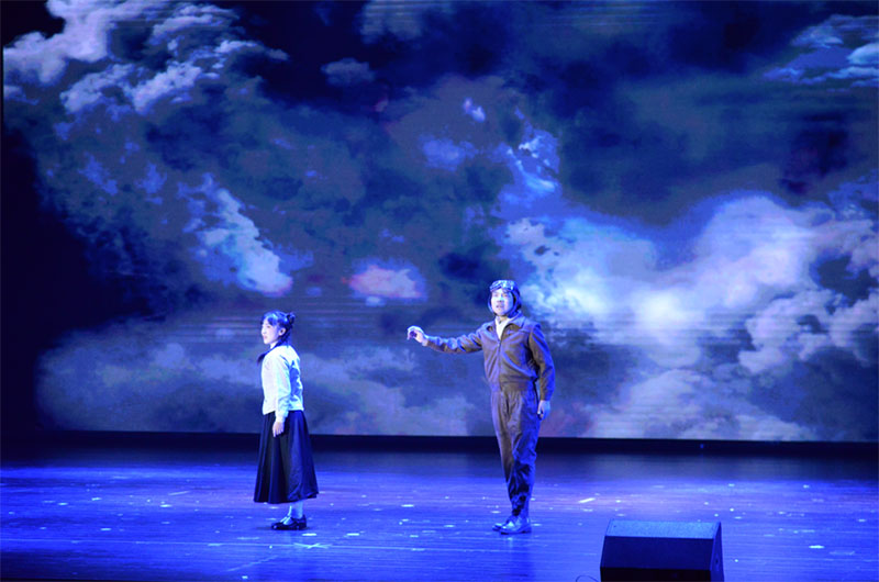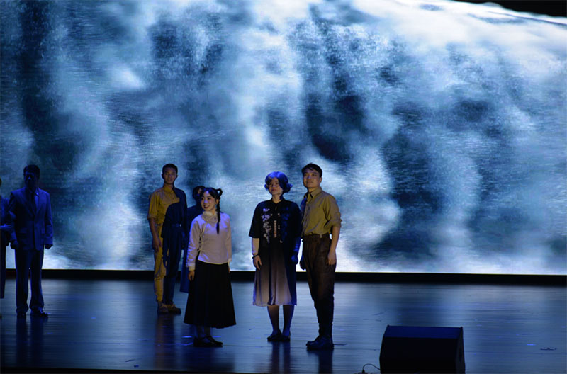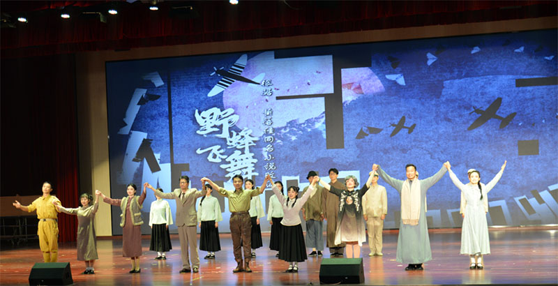 灯光渐暗,一首激昂却又隐透着哀婉的钢琴曲《野蜂飞舞》响彻整个报告厅。橙子奶奶在数年后回望过去的岁月,她那不姓“黄”却如有真血缘一般的天路哥哥,在烽火连天的日子最终活成了顶天立地的脊梁,用生命换来没有敌人飞机的天空。瀑布云下,他的故事在我们心里砸出永不平息的巨响。当白发苍苍的黄橙子与记忆中那个稚嫩的少女的身影重合,所有人出现在她的眼前他们的生命与家国命运紧紧相连,那份勇气穿越时空,依然滚烫。