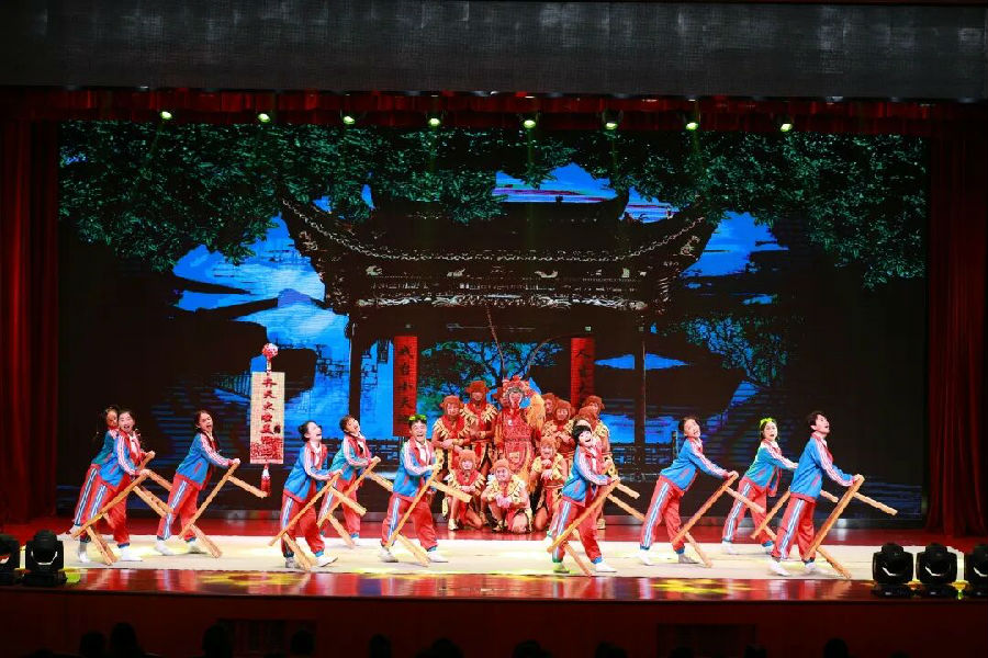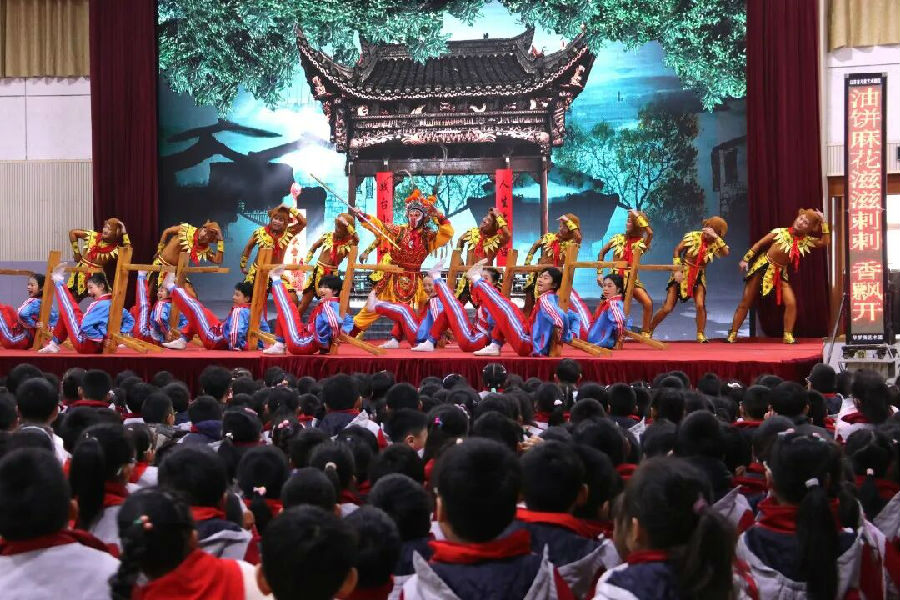 跌宕起伏的剧情引发大家的共鸣,当庄石兰在古戏台前独舞水袖时,全场屏息凝神;猴戏排练中的滑稽桥段令孩子们捧腹大笑;真假美猴王对决的高潮段落,更让不少师生赞叹不已。当台上的美猴王走到台下与孩子们互动时,现场气氛瞬间被点燃,一双双小手争先恐后地伸向前方,欢呼声与掌声此起彼伏,纯真的笑脸与“美猴王”灵动的身姿交织成一幅其乐融融的传承画卷。