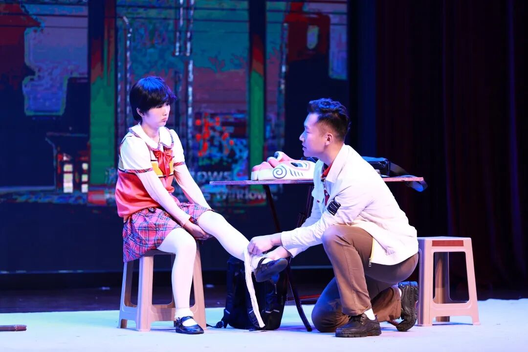 剧中,庄石兰因进城求学被迫暂别猴戏,却始终珍藏祖传“美猴王”面具,与新同学孙小强秘密排练时引发意外冲突,最终以经典京剧选段《真假美猴王》化解矛盾,完成对传统文化的深情致敬。演员们以精准的唱念做打展现戏曲功底:水袖翻飞如行云流水,把子功对打刚劲有力,猴戏表演惟妙惟肖,配合多媒体舞台特效,将“台上一分钟,台下十年功”的艺术真谛演绎得淋漓尽致。