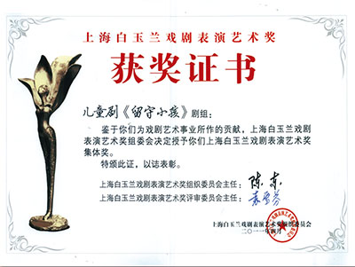 2011年4月大型现代儿童剧《留守小孩》荣获第21届上海白玉兰戏曲表演艺术奖、集体奖。