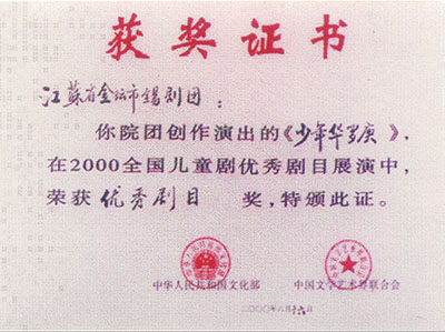 2000年《少年华罗庚》在全国儿童剧优秀剧目展演中荣获优秀剧目奖。