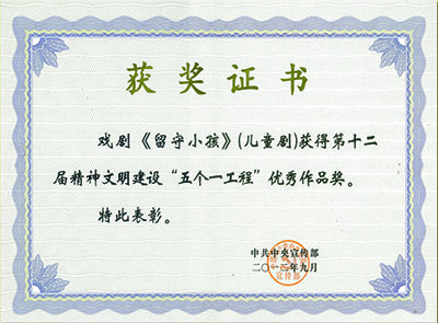 2012年9月25日《留守小孩》荣获全国第十二届精神文明建设“五个一工程”奖。《留守小孩》作为唯一一部儿童剧完美入选。