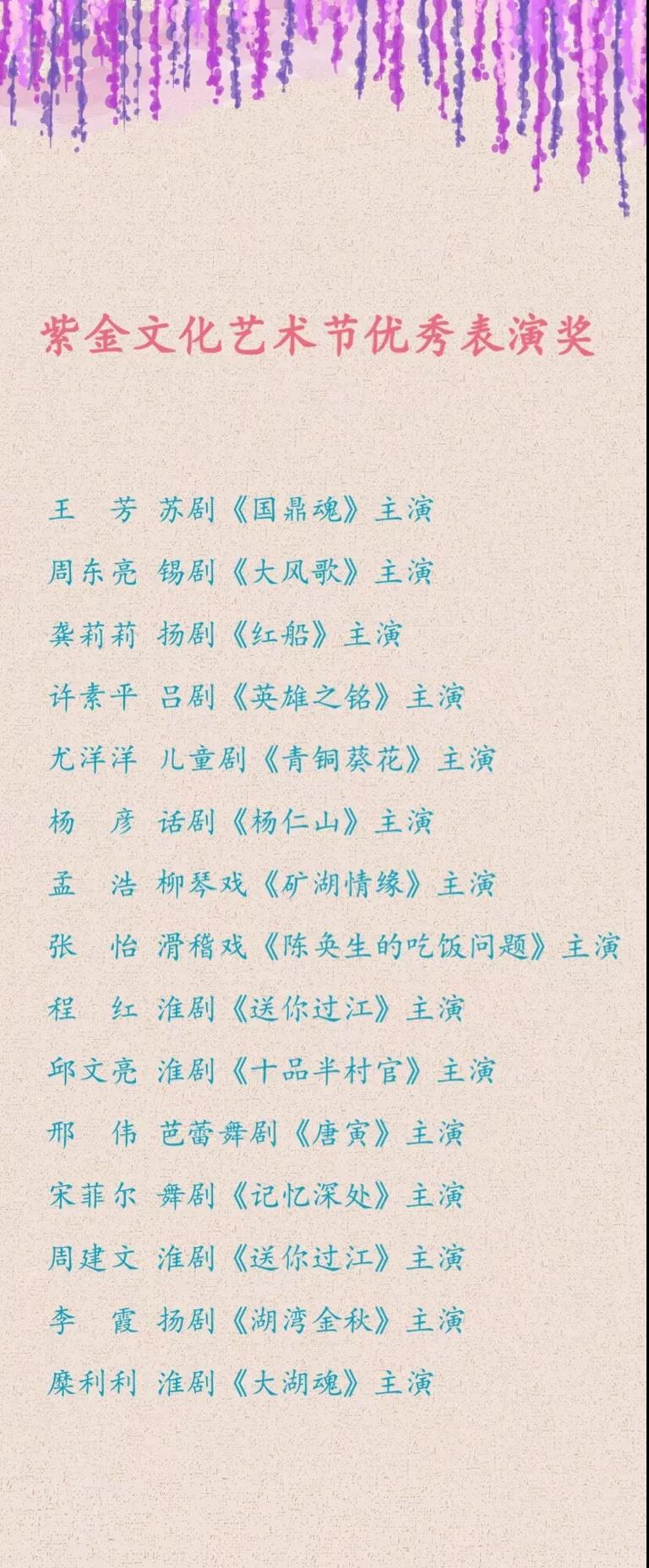 10月27日的闭幕仪式上,15位来自参演剧目的演员荣获此次紫金文化艺术节的“优秀表演奖”。下图为获奖名单: