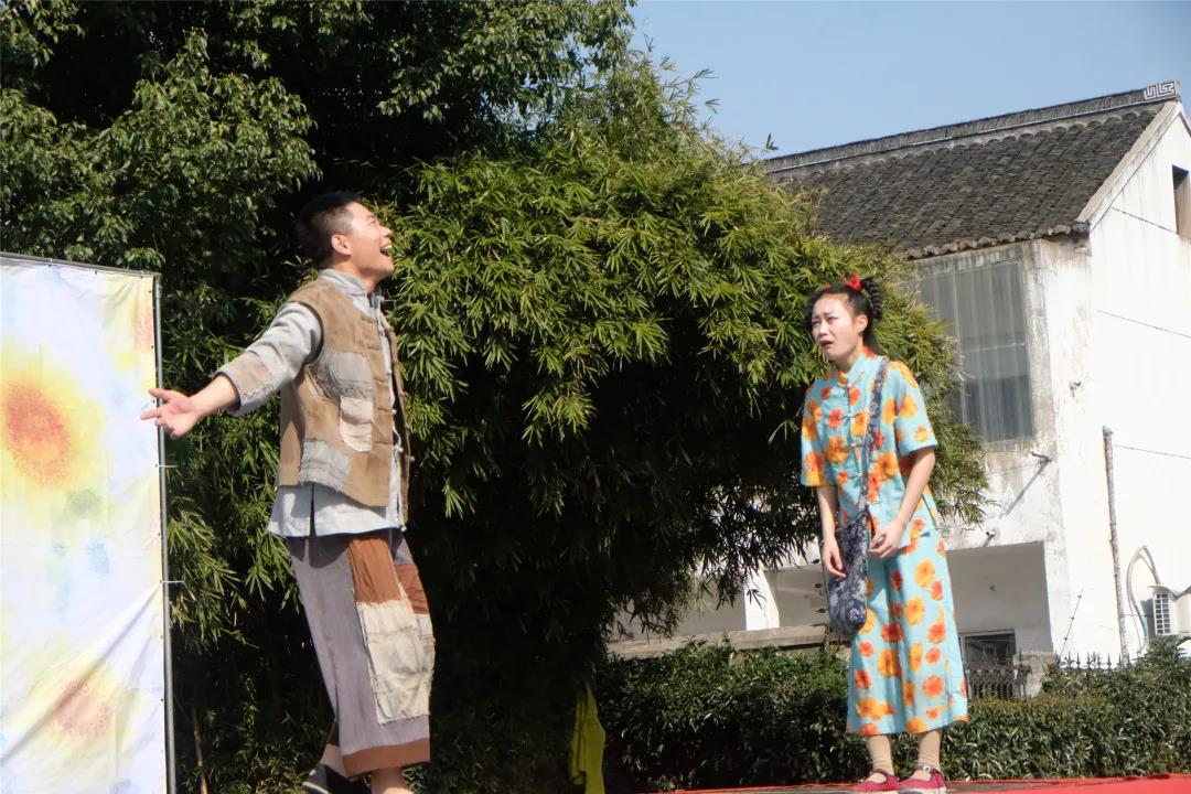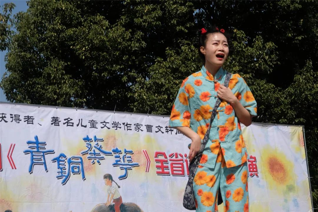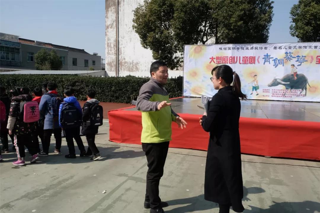 表演结束,全体演出人员和师生一起深情吟唱儿童剧《青铜葵花》主题曲。低年级曹老师和剧团负责人亲切交流。