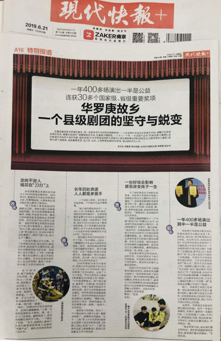 在著名数学家华罗庚的家乡,有一支原本名不见经传的县级剧团——江苏省常州市金坛华罗庚艺术团。借着文化体制改革的东风,靠着全团演员“端着饭碗走市场,扛着被子睡剧场,一人千人一个样,一天四场不走样”的艰苦奋斗精神以及对表演艺术始终不渝的热爱,接连创排《少年华罗庚》《田梦儿》《留守小孩》《青铜葵花》等9部现实主义题材原创儿童剧,获得30多个国家级、省级重要奖项,在江苏、北京、上海等地巡演8000多场,观众超800万人次……