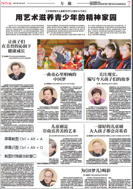 近代教育家蔡元培曾说:“美育者,与智育相辅而行,以图德育之完成者也。”近年来,江苏围绕立德树人的根本任务,注重价值引领、精神塑造,从最能引起共识的“爱、敬、诚、善”入手,运用诗教乐教等多种美育形式滋润青少年价值观。先后立足江苏、面向全国,组织开展了“童心里的诗篇”全国少儿诗会、“童声里的中国·成长的歌谣”创作大赛、“童真里的色彩”儿童画创作大赛,打造了“童”字系列美育品牌。推出了《“八礼四仪”养成教育通俗绘本》《美德少年文学故事丛书》《璞石成玉的秘密——孩子们心中的社会主义核心价值观》等一批思想性和艺术性相结合的青少年读物;组织编创了包括音乐儿童剧《田梦儿》、木偶剧《穿越“无礼国”》、动画片《加油吧!三二班》《东方七色花》等一批贴近少儿生活、体现童真童趣、催人向上向善的优秀文艺作品,引导孩子们从中发现、感受、追求真善美。继《田梦儿》之后,我们将于今年5月推出未成年人文明礼仪养成教育儿童剧《寻找红头发》,今年还将组织编创改编自曹文轩作品《青铜葵花》的同名儿童剧,努力为孩子们创作更多更好的精神食粮。
