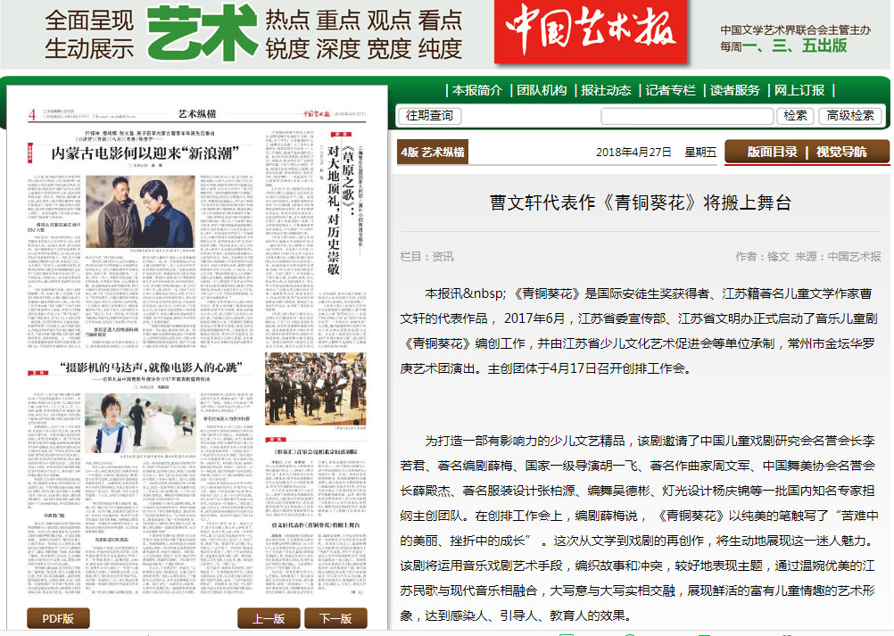 中国文化报:音乐儿童剧《青铜葵花》即将开排