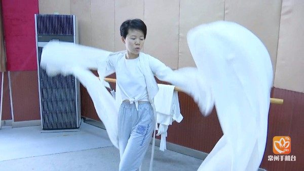 华罗庚艺术团演员李萌说:“这个水袖是戏曲里面的专业水袖,它的长度有两米三。因为我们女孩子们基本上都不是专业的戏曲演员,她们练这个水袖就特别的吃力,但是她们都不怕苦,都坚持下来了。”