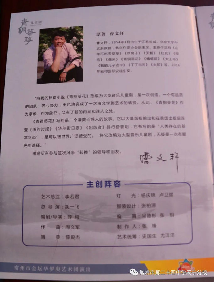 音乐儿童剧《青铜葵花》根据曹文轩同名小说改编,由江苏省委宣传部、省文明办、常州市委宣传部、市文明办等部门重点打造,金坛华罗庚艺术团创作排演。该剧以上世纪70年代的苏北农村为背景,讲述一对没有血缘关系的兄妹--青铜、葵花之间发生的故事。全剧通过收养、让学、活着、离别等多个片段,展现“苦难中的美丽、挫折中的成长”。