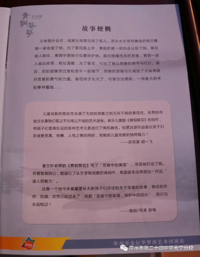 2021年4月8日下午,由市金坛华罗庚艺术团带来的音乐儿童剧《青铜葵花》在我校800人报告厅演出。七、八年级师生分两场进行了观看。