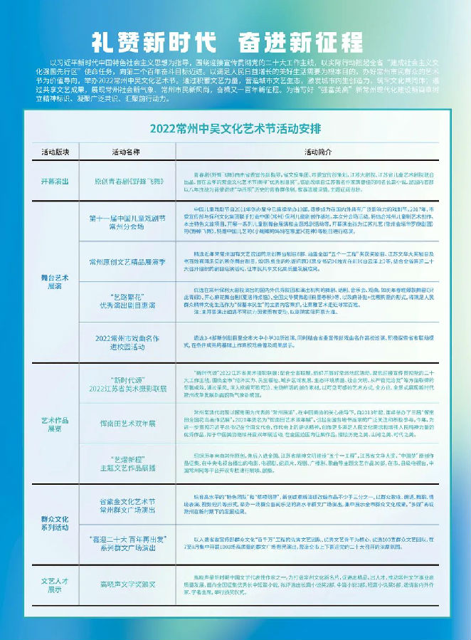 2022常州中吴文化艺术节以“礼赞新时代 奋进新征程”为主题,围绕迎接庆祝党的二十大胜利召开,在7到12月的6个月时间内,开展开幕演出、舞台艺术展演、艺术作品展览、群众文化活动、文艺人才展示等5个版块10类千余场活动。