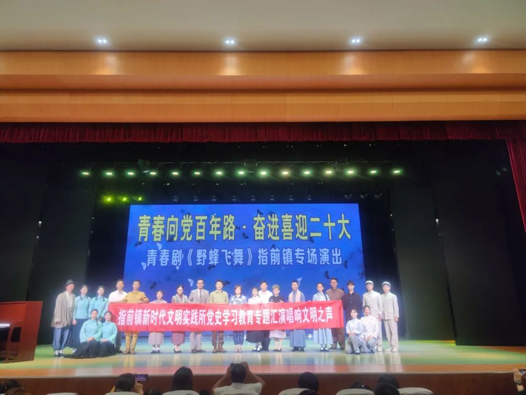 为迎接党的二十大胜利召开,7月30日下午,由中共常州市金坛区委宣传部、金坛区文体广电和旅游局、指前镇新时代文明实践所主办,江苏省儿童艺术剧院(华罗庚艺术团)出演的“青春向党百年路·奋进喜迎二十大”青春剧《野蜂飞舞》指前镇专场在华罗庚艺术团演播大厅盛大演出。来自全镇180余位党员群众参与观看。