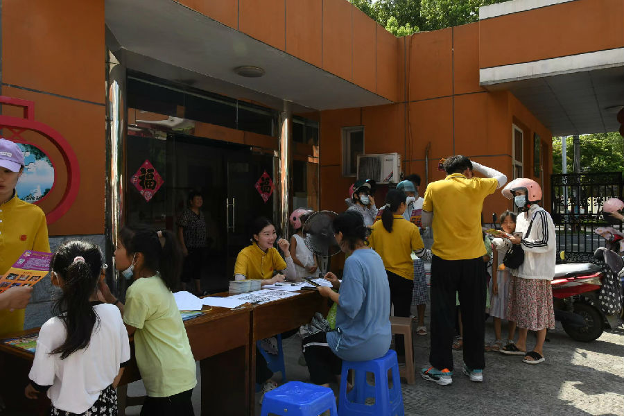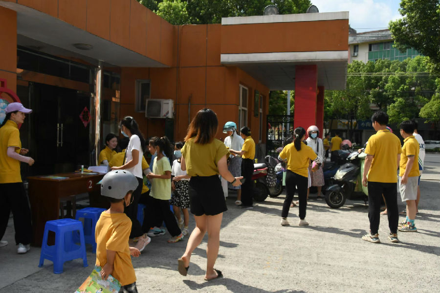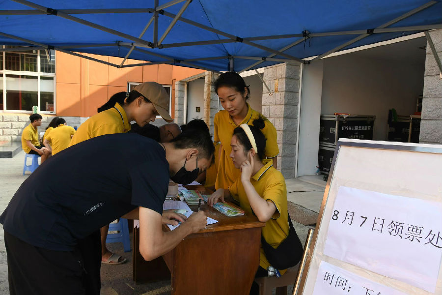 家长和孩子们取票的场景。