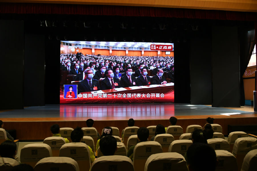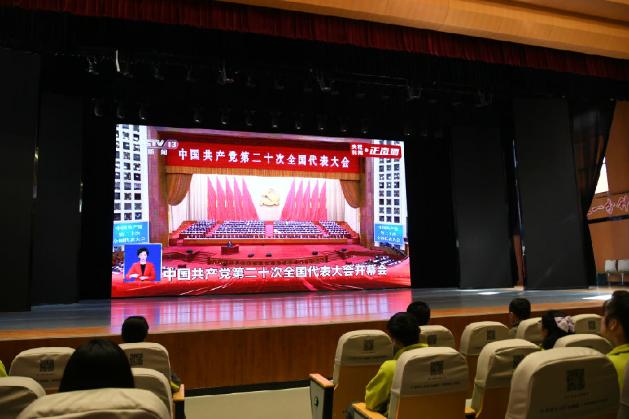 江苏省儿童艺术剧院(华罗庚艺术团)全体演职员工,在剧院演出大厅收看中国共产党第二十次全国代表大会开幕会盛况,共同见证这一激动人心的时刻。