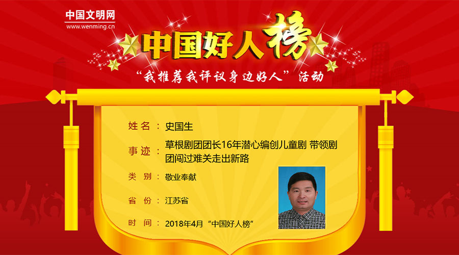 ![]() 中国文明网:草根剧团团长16年潜心编创儿童剧 带领剧团闯过难关走出新路人物故事: 史国生,男,1964年8月出生,金坛区锡剧团(华罗庚艺术团)团长,国家二级演员。 1982年,史国生以全能考试第一名的成... |